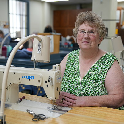 Hartbarger has worked at VMI for nearly 25 years. She started in laundry services, then the military store, then the post office. She’s been at the tailor shop for about 17 years. Even though she does the administrative side of the tailor shop, she’s still mending clothes. One of the first things she did when she took over as manager was move her sewing machine to her new desk. Now, she mends, emails, answers calls, and manages the team.