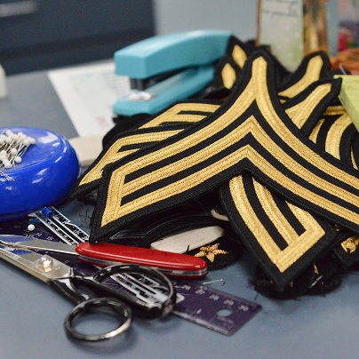 Everything they do in the tailor shop is tedious work that takes time and concentration. To put a stripe on could take half an hour. A chevron would take an hour, but the higher the rank, the longer it could take — potentially up to two hours.