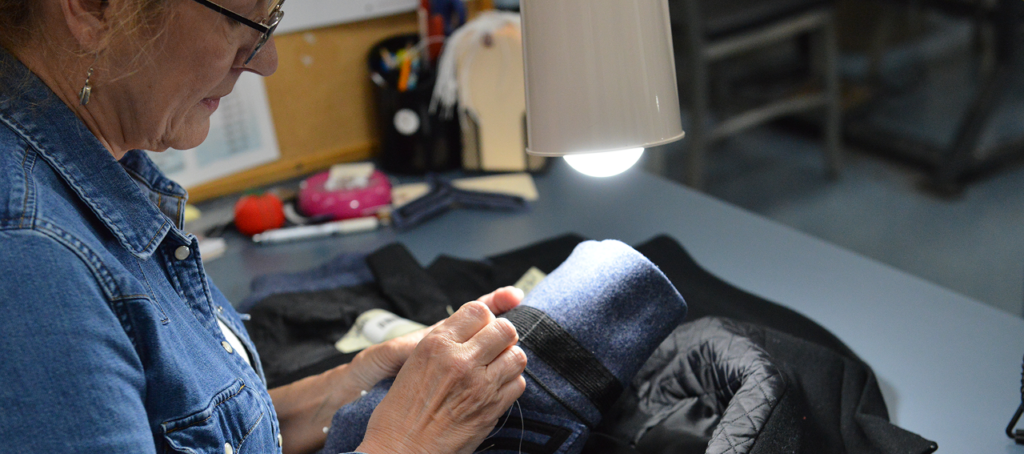 Hartbarger has worked at VMI for nearly 25 years. She started in laundry services, then the military store, then the post office. She’s been at the tailor shop for about 17 years. Even though she does the administrative side of the tailor shop, she’s still mending clothes. One of the first things she did when she took over as manager was move her sewing machine to her new desk. Now, she mends, emails, answers calls, and manages the team.